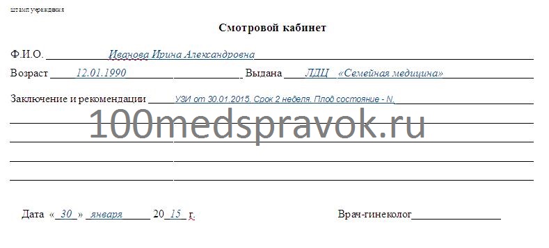 В частном кабинете акушера-гинеколога вы можете оформить такой документ за один день, ведь такие кабинеты имеют все необходимое оборудование для ультразвуковой диагностики. Что касается стоимости справки, то она зависит в основном от политики самой клиники: в крупных городах стандартный прием специалиста стоит примерно 500 рублей, столько же придется заплатить и за ультразвуковое исследование.